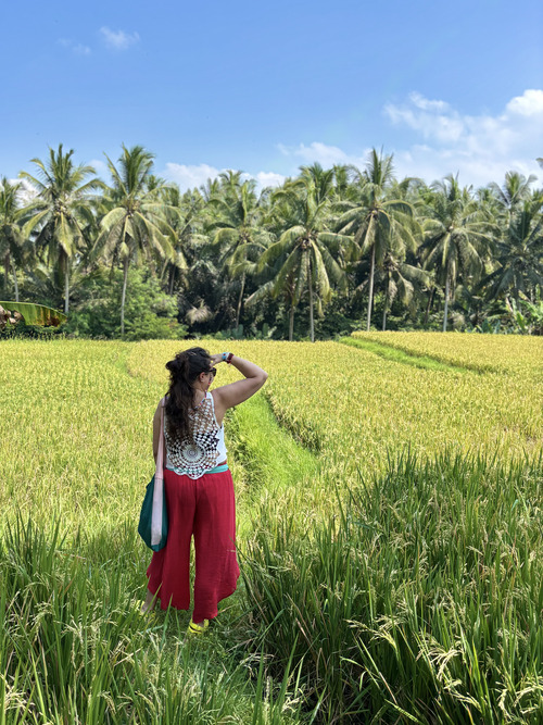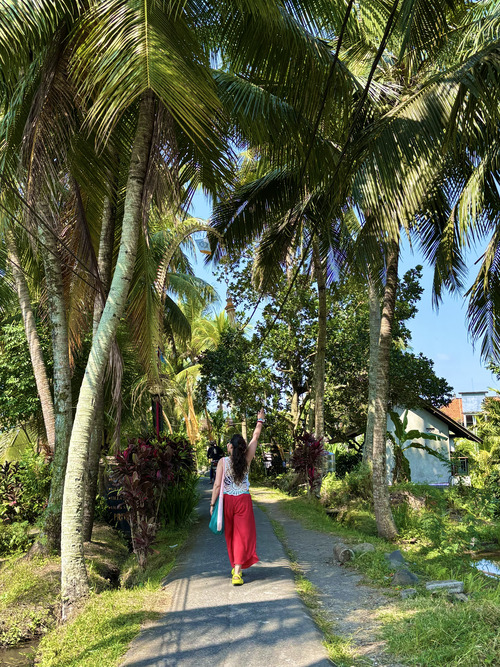 En nuestro caso entramos por Prianka Ubud Market, y una vez en Kajeng Rice Field, caminamos por un sendero entre palmeras con restaurantes y cafeterías que tenían vistas a los arrozales, terminado en Sweet Orange Walk Trail.