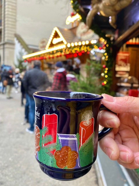 ✎ Cuando pidas un vino caliente (u otra bebida) en cualquiera de los mercados navideños de Basilea, verás que te lo sirven en una taza (su nombre weihnachtstasse). Es así como se toma, como si fuese un ColaCao. Y tampoco te extrañe que te pidan una fianza, que te devolverán cuando retornas la taza.