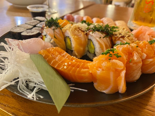 La recomendación para comer en el mercado Campo de Ourique es lo que más te apetezca, porque tienen marisco, pescado o carne de calidad. Es un espacio gastronómico con varios puestos donde sirven comida y bebida junto a las fruterías, carnicerías y pescaderías. Compras lo que te apetece y comes en un patio central con mesas y sillas. Nosotros probamos el sushi y estaba buenísimo.