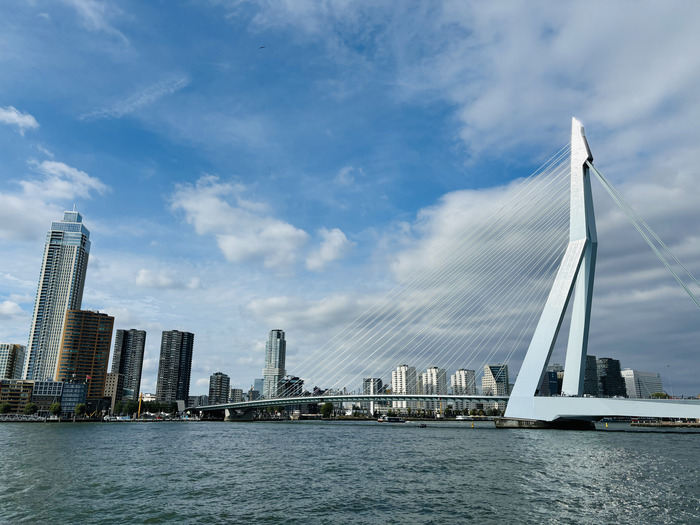 Erasmus es un puente de 800 metros de longitud con un pilón asimétrico de 139 metros de altura que cruza el río Nieuwe Maas, uniendo la zona norte y sur de Róterdam. Si te fijas tiene forma de cisne, de ahí su apodo (De Zwaan).