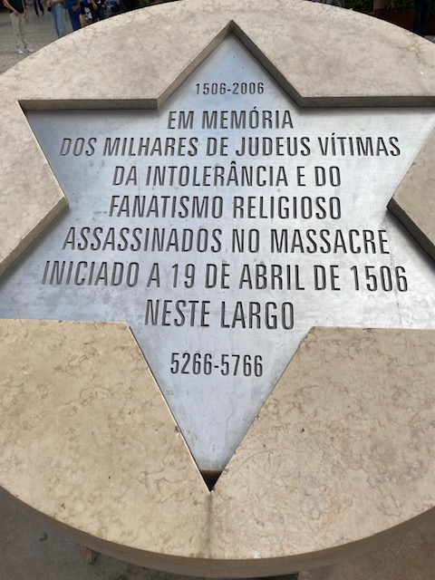 - Placa de mármol blanco junto con una paloma de La Paz, donde la iglesia pide perdón por aquella matanza. La inscripción dice: «En memoria de los millares de judíos víctima de la intolerancia y del fanatismo religioso, asesinados en la masacre del 19 de abril de 1506».