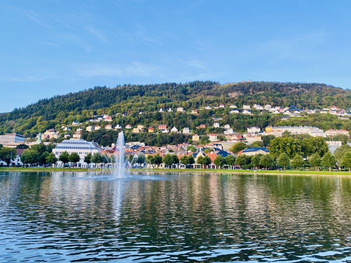 En Festplassen tienes un parque con un lago artificial (Lille Lungegårdsvannet), rodeado de colinas y con las casitas típicas de madera a su alrededor.
